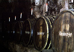 Das Geheimnis des Klosters Eberbach schlummert hinter einem verrammelten Eisengitter. „Nein, ich kann ihnen nicht aufschließen, dazu habe ich keinen Schlüssel“, flüstert Martina Friedrich. Die Weinfachverkäuferin herrscht vielleicht über die Vinothek des Klosters, aber hier versagt ihre Autorität. An dem Gitter prangt der eherne Schriftzug ‚Schatzkammer’. Aber so sehr das Auge späht: vom Schatz ist nichts zu sehen. Ein moderiger, säuerlicher Geruch liegt in der Nase - Wein. Flaschen im Wert von Millionen Euro seien hier gelagert, schwärmt Martina Friedrich. Zweimal jährlich landen die Schätze der Hessischen Staatsweingüter Kloster Eberbach, welche die einst klösterlichen Weinberge bewirtschaften, auf einer spektakulären Auktion. „Es gibt eine Schatzchronik, in der jede eingegangene und herausgegebene Flasche verzeichnet ist“, hallen die Worte von Friedrich. Hier im Hospitalkeller des Klosters verlieren sich die hohen Säulen im Dunkeln. Nur eine zechende Touristengruppe stört im fast sakralen Raum.